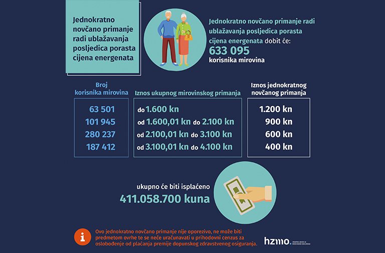 U petak 13. svibnja 2022. počinje isplata jednokratnog novčanog primanja korisnicima mirovine radi ublažavanja posljedica porasta cijena energenata.