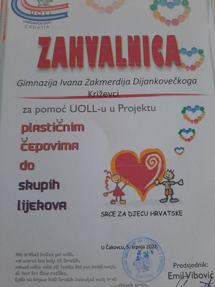 U utorak, 5. srpnja 2022. Gimnazija Ivana Zakmardija Dijankovečkog Križevci dostavila je plastične čepove Udruzi oboljelih od leukemije i limfoma u Čakovcu (UOLL). Akcija prikupljanja čepova u njihovoj školi traje cijelu godinu. Čepove prikupljaju učenici i djelatnici, a povremeno ih u školu dostavljaju i umirovljeni profesori Gimnazije. Uz sakupljene čepove često dodaju svoje i učenici i djelatnici Srednje Gospodarske škole u Križevcima, a ovaj puta su čepove poslali i članovi udruge Maslačak.