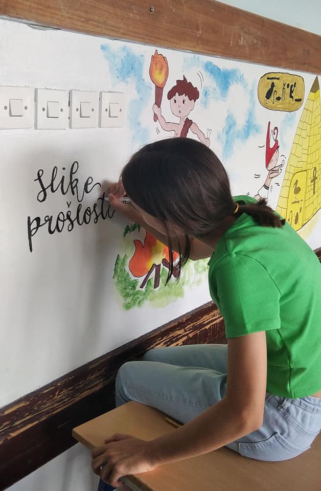 Izabela je odabrala osam slika iz prošlosti od prapovijesti do sadašnjosti, maštovito i zabavno ih osmislila te ih nacrtala na zid. Uz pomoć vrijednih pomoćnica Lade, Katje i Franke zid je bio obojen i završen u nekoliko dana. Iako je bilo pakleno vruće, djevojke su se zabavljale i zadovoljne su rezultatom. Nadaju se da će se njihov uradak svidjeti i ostalim učenicima te da će im boravak i rad u ovako ukrašenoj učionici biti ugodniji i produktivniji.