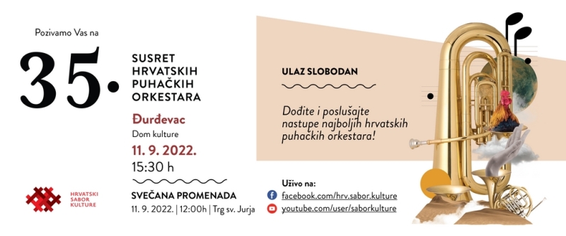 Grad Đurđevac će ovog vikenda biti domaćin 35. Susreta hrvatskih puhačkih orkestara koji će okupiti 12 najboljih hrvatskih amaterskih orkestara iz devet hrvatskih županija s više od 420 glazbenika. Susret će se održati u dvorani Doma kulture u nedjelju 11. rujna s početkom u 15.30 sati, a uz domaćine, Puhački orkestar DVD-a Đurđevac, na susretu će sudjelovati Glazba Ston, Puhački orkestar DVD-a Valpovo, Puhački orkestar Općine Nedelišće, Puhački orkestar Goričan, Gradska glazba Virovitica, Gradska glazba Samobor, Puhački orkestar DVD-a Gornji Desinec, Puhački orkestar „Naša sloga“ Babići, Vodička glazba, Gradski puhači orkestar Križevci i Gradski puhački orkestar Hrvatskih željeznica Varaždin.