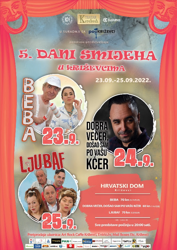 Udruga K.V.A.R.K., Kerekesh Teatar i Pučko otvoreno učilište Križevci s ponosom najavljuju 5. Dane smijeha u Križevcima koji će se održati od 23. do 25. rujna 2022. godine u Velikoj dvorani Hrvatskog doma! Kerekesh Teatar, sada Križevčanima već dobro poznatom manifestacijom “Dani smijeha”, ponovo će oduševiti sve ljubitelje građanskih komedija i Prigorce svih dobnih skupina.