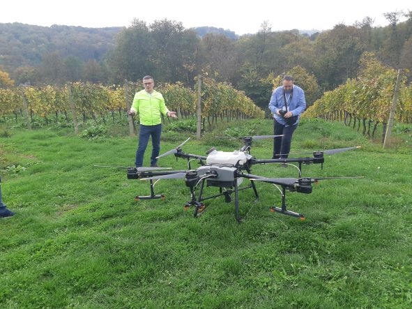 Nakon toga su djelatnici Digital Agro održali predavanje na temu snimanja poljoprivrednih površina multispektralnim kamerama i tretiranja usjeva pesticidima uz pomoć dronova. Završetkom predavanja sudionici su u vinskom kampu Hažić imali prilike vidjeti demonstraciju leta dronom DJI Agras T30 i prskanje vinograda iz zraka.