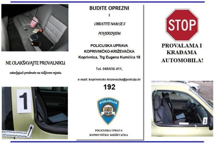 Kako ne bi došlo do počinjenja takvih kaznenih djela, savjetujemo građane da svoje automobile, ali i ostale prostore zaključavaju te da u automobilima na vidljivim mjestima ne ostavljaju vrijedne predmete (osobne dokumente, torbice, mobitele, novčanike), a sve s ciljem kako bi se smanjila mogućnost provala u automobile i krađa predmeta iz njih.