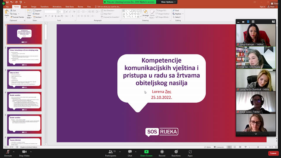 Udruga HERA je organizirala online edukaciju “Kompetencije komunikacijskih vještina i pristupa u radu sa žrtvama obiteljskog nasilja”. Edukaciju je održala Lorena Zec, psihologinja udruge SOS Rijeka – Centar za nenasilje i ljudska prava. Lorena Zec ima dugogodišnje iskustvo u direktnom radu sa ženama žrtvama nasilja i žrtvama obiteljskog nasilja.