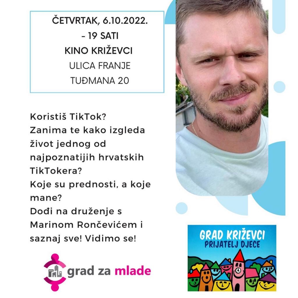 U današnje vrijeme kada djeca i mladi sve više prate Youtube i Tiktok zvijezde, rijetko tko se od njih pita što se zapravo nalazi u pozadini i kako zapravo izgleda život jednog influencera. Iz tog razloga, jedan od najpoznatijih hrvatskih Tiktokera, Križevčanin Marin Rončević održat će predavanje u četvrtak, u 19,00 sati u Kinu Križevci i predstaviti kako je to biti TikToker, koje su prednosti, ali i koji nedostaci. Predavanje je namijenjeno učenicima osnovnih i srednjih škola.