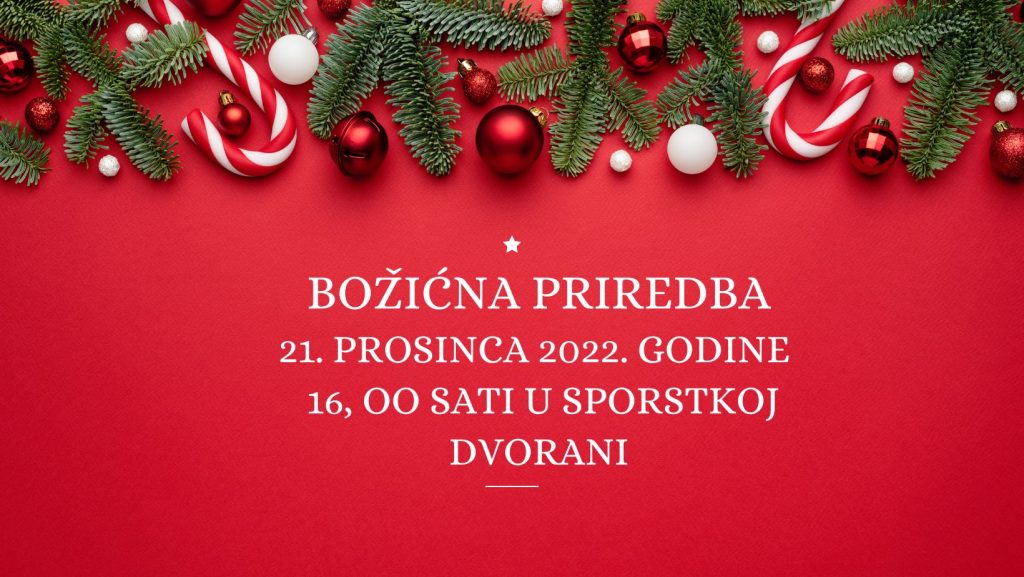 Božićna priredba održat će se 21. prosinca (srijeda) 2022. god. od 16:00 sati u Sportskoj dvorani u Svetom Petru Orehovcu. Zbog toga će satovi biti skraćeni na 30 minuta.