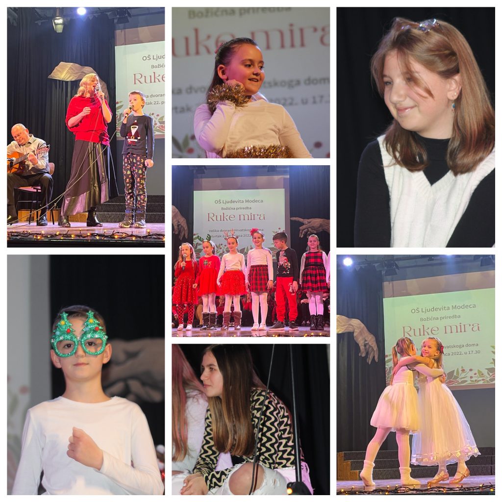 Učenici i nastavnici Osnovne škole Ljudevita Modeca večeras su u prepunoj Velikoj dvorani Hrvatskog doma priredili božićnu priredbu “Ruke mira”. Nastupili su učenici nižih i viših razreda škole, učenici 2.r. PŠ Veliki Raven, Mali zbor škole, plesne skupine te Ana Fortuna zajedno sa svojim ocem Stjepanom i sinom Davidom.
