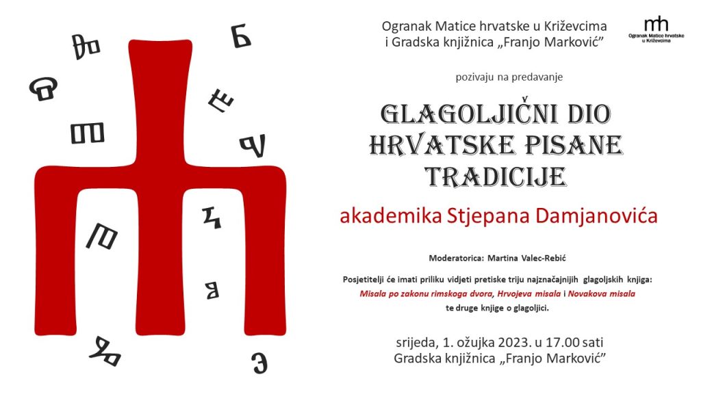 Ogranak Matice hrvatske u Križevcima i Gradska knjižnica “Franjo Marković” Križevci pozivaju na predavanje” Glagoljični dio hrvatske pisane tradicije” akademika Stjepana Damjanovića u srijedu 1. ožujka 2023. s početkom u 17 sati u multimedijskoj dvorani Gradske knjižnice.