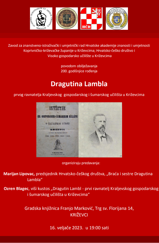 Zavod za znanstveno-istraživački i umjetnički rad Hrvatske akademije znanosti i umjetnosti Koprivničko-križevačke županije u Križevcima, Hrvatsko-češko društvo i Visoko gospodarsko učilište u Križevcima povodom obilježavanja 200. godišnjice rođenja DRAGUTINA LAMBLA, prvog ravnatelja Kraljevskog gospodarskog i šumarskog učilišta u Križevcima, organiziraju predavanja u Gradskoj knjižnici Franjo Marković, Trg sv. Florijana 14, Križevci. Održati će se 16. veljače 2023. u 19:00 h.