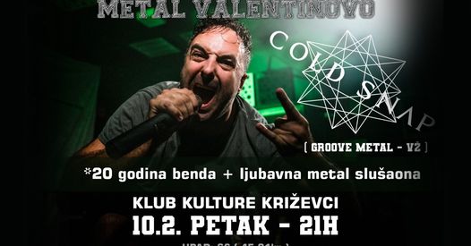 Pozivamo vas da u Klubu kulture 10. veljače proslavite Dan zaljubljenih uz 20 godina groove metal benda Cold Snap i ljubavnu metal slušaonu! Ovi varaždinski metalci predvođeni karizmatičnim Janom Kerekešom spremaju nekonvencionalnu i energičnu proslavu Valentinova, stoga zgrabite vaše bolje polovice pod ruke ili pak samopouzdano ušetajte solo, pokažite svima da ste sami sebi i više nego dovoljni i dobro protresite glave na žestoke groove metal ritmove.