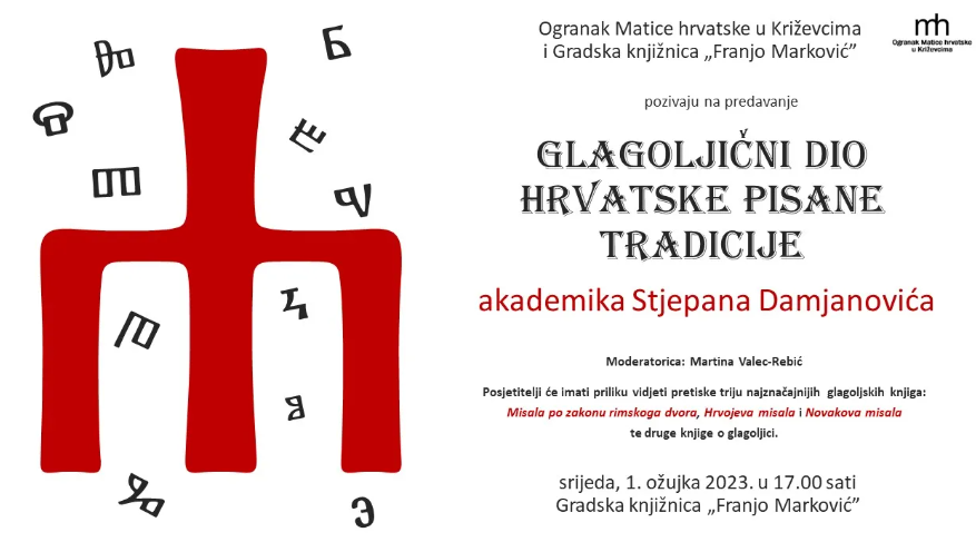 Ogranak Matice hrvatske u Križevcima i Gradska knjižnica “Franjo Marković” Križevci pozivaju na predavanje” Glagoljični dio hrvatske pisane tradicije” akademika Stjepana Damjanovića, danas s početkom u 17 sati u multimedijskoj dvorani Gradske knjižnice.