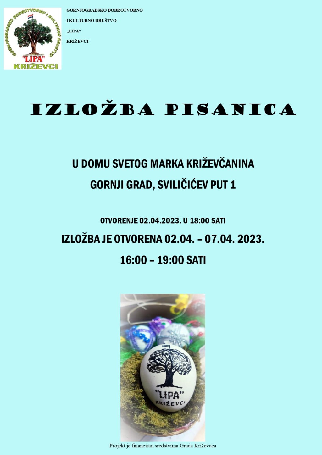 21. izložba domaćih i europskih pisanica GDKD “Lipa” održat će se u Križevcima 2. travnja s početkom u 18 sati.