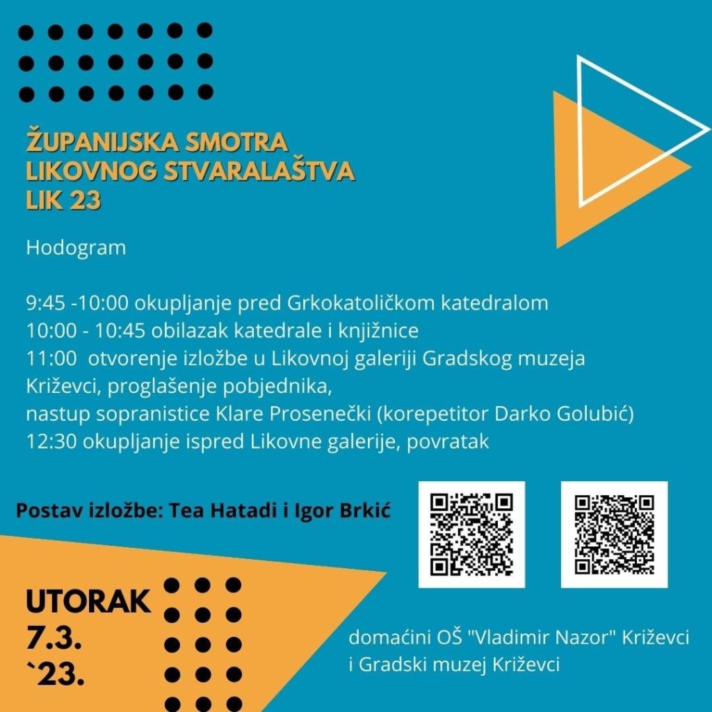 Županijska smotra likovnog stvaralaštva održat će se u utorak, 7. ožujka 2023. godine u Križevcima. Otvorenje i proglašenje pobjednika bit će u Likovnoj galeriji Gradskog muzeja Križevci s početkom u 11 sati.