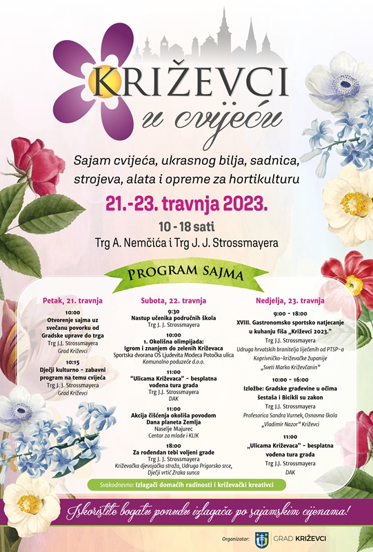 Na Nemčićevom i Strossmayerovom trgu od 21. do 23. travnja održat će se sajam cvijeća „Križevci u cvijeću“. Riječ je o sajmu cvijeća, ukrasnog bilja, sadnica, strojeva, alata i opreme za hortikulturu, a na kojem će se također moći razgledati radovi izlagača domaćih radinosti i križevačkih kreativaca.