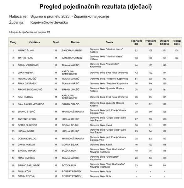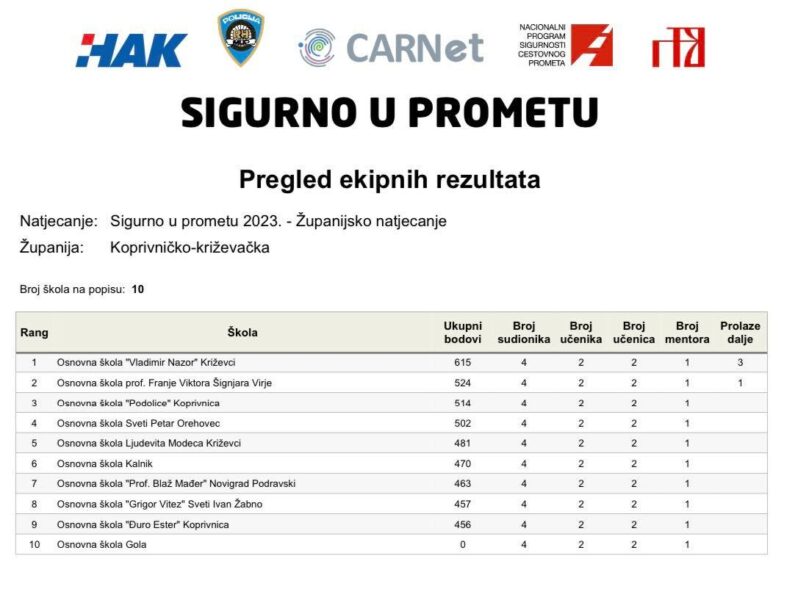 Županijsko natjecanje “Sigurno u prometu” održano je u Gornjoj Rijeci. Učenici Osnovne škole “Vladimir Nazor” Križevci osvojili su 1. mjesto, a na državno natjecanje koje će se održati u Zadru, plasirali su se Magdalena Matešić (1. mjesto, djevojčice), Marko Šijan (1. mjesto, dječaci) i Mateo Plak (2.mjesto, dječaci).
