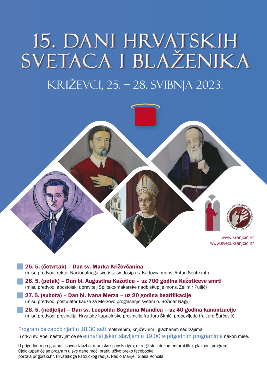 U Križevcima će od četvrtka 25. do nedjelje 28. svibnja 2023. biti održani 15. Dani hrvatskih svetaca i blaženika. Pretprogramom i misnim slavljem ove će godine biti tematizirani sv. Marko Križevčanin, bl. Augustin Kažotić, bl. Ivan Merz i sv. Leopold Bogdan Mandić.