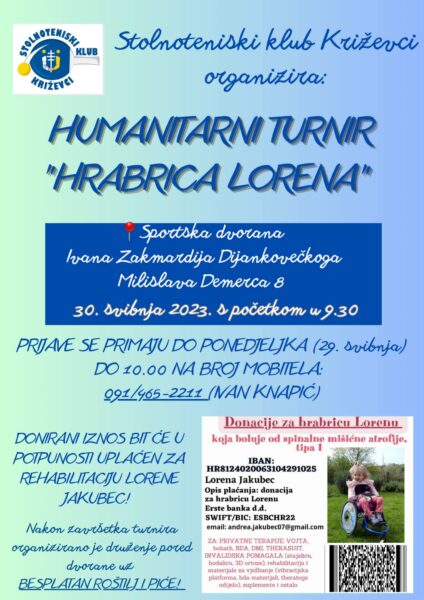 Stolnoteniski klub Križevci organizira humanitarni turnir za “Hrabricu Lorenu”