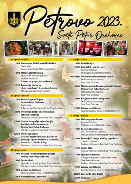 AKTUALNO Pogledajte program ovogodišnje manifestacije u Svetom Petru Orehovcu “Petrovo 2023” 26/06/2023 Donosimo kompletan program manifestacije “Petrovo 2023” u Svetom Petru Orehovcu. Continue Reading Prijašnja vijest Streljački klub “Križevci 1252” ima prvake HrvatskeSljedeće Križevačke mažoretkinje stekle vrijedno iskustvo na Europskom prvenstvu Propustili ste: AKTUALNO SPORT Nordijski hodači na prijemu kod gradonačelnika 13/10/2025 AKTUALNO SPORT Gradonačelnik održao prijem za sudionike Svjetskog prvenstva u obaranju ruke 13/10/2025 AKTUALNO KULTURA Svečani koncert povodom 5. obljetnice hirotonije mons. Milana Stipića 12/10/2025