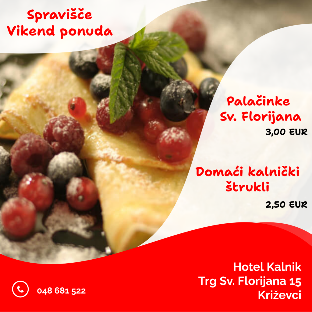 “Iz ponude svakako izdvajamo orginalne deserte goruće palačinke Sv. Florijana i domaće kalničke štrukle koje su dobile već nekoliko zlatnih medalja na različitim natjecanjima”, poručili su iz Hotela. U nastavku pogledajte ponudu jela tijekom 55. Križevačkog velikog spravišča.