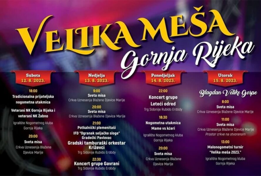 Općina Gornja Rijeka i ove godine organizira manifestaciju “Velika meša 2023.” povodom obilježavanja blagdana Velike Gospe. Bit će vjerskih i sportskih sadržaja, bit će bogata i gastro ponuda.