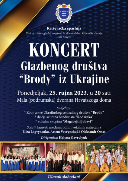 Križevačka eparhija, Ured za crkvenu glazbu, umjetnost i kulturna dobra Križevačke eparhije i Grad Križevci pozivaju na koncert Glazbenog društva “Brody” iz Ukrajine koji će se održati u ponedjeljak, 25. rujna 2023. u 20 sati u Maloj (podrumskoj) dvorani Hrvatskoga doma.
