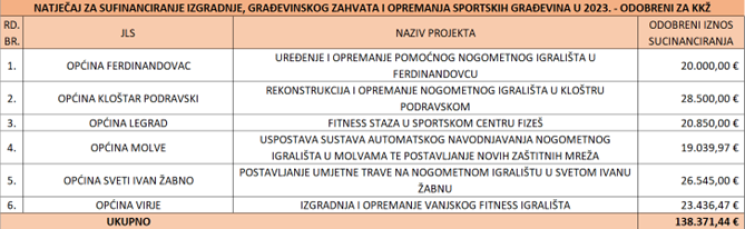 Ministarstvo turizma i sporta odobrilo je financiranje 6 projekata iz Koprivničko-križevačke županije u ukupnom iznosu o 138.371,44 EUR i to kako slijedi: