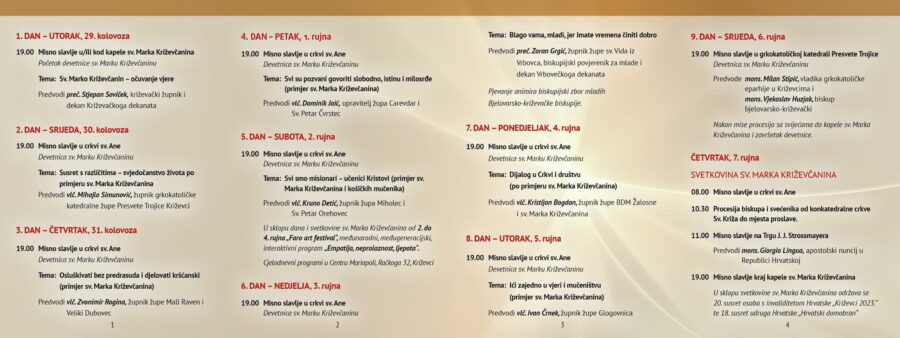 Svetkovina sv. Marka Križevčanina svečano će biti proslavljena u Križevcima u četvrtak 7. rujna 2023. Euharistiju će predvoditi mons. Giorgio Lingua, apostolski nuncij u Republici Hrvatskoj.