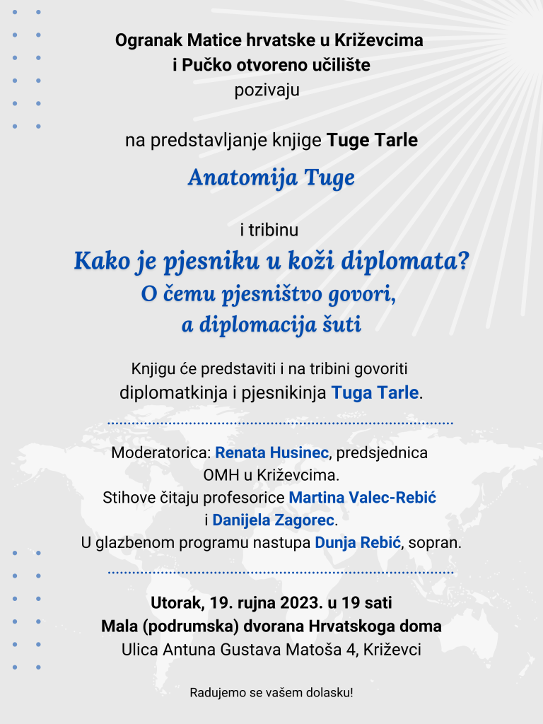 Ogranak Matice hrvatske u Križevcima i Pučko otvoreno učilište organiziraju predstavljanje knjige Tuge Tarle “Anatomija Tuge” i tribinu “Kako je pjesniku u koži diplomata? – O čemu pjesništvo govori, a diplomacija šuti. ”