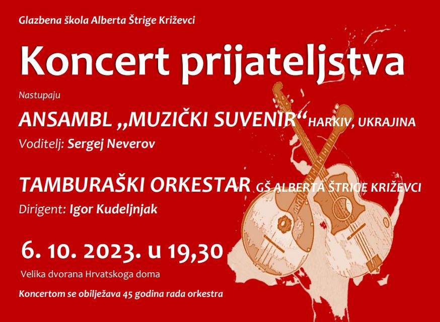 Tamburaški orkestar Glazbene škole Alberta Štrige Križevci poziva na Koncert prijateljstva kojim će obilježiti 45. godišnjicu postojanja Tamburaškog orkestra. Koncert će se održati 6. listopada 2023. godine u suradnji s ansamblom „Muzički suvenir“ iz Harkiva, Ukrajina pod vodstvom Mo. Sergeja Neverova u Velikoj dvorani Hrvatskog doma u Križevcima s početkom u 19.30 sati.