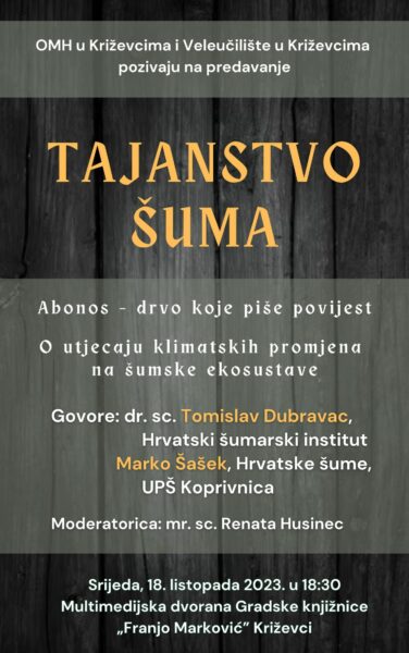 Ogranak Matice hrvatske i Veleučilište u Križevcima pozivaju na predavanje “Tajanstvo šuma”. Predavanje će se održati u srijedu, 18. listopada u 18.30 sati u Multimedijskoj dvorani gradske knjižnice “Franjo Marković” Križevci, a govorit će Tomislav Dubravac i Marko Šašek.