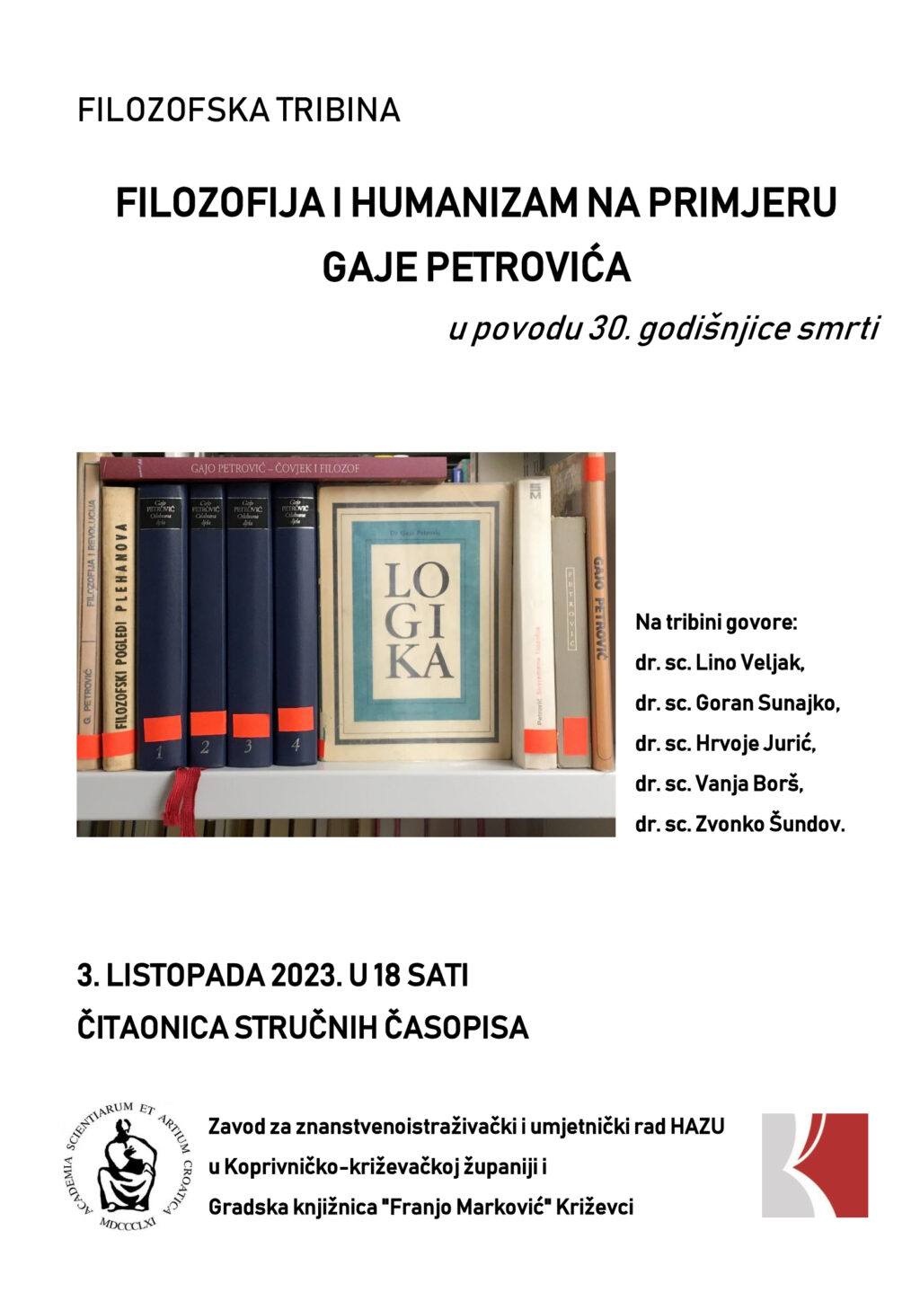 Gradska knjižnica „Franjo Marković“ Križevci i Zavod za znanstveno-istraživački i umjetnički rad HAZU Koprivničko-križevačke županije u Križevcima pozivaju Vas na filozofsku tribinu Filozofija i humanizam na primjeru Gaje Petrovića, u povodu 30. godišnjice njegove smrti u utorak, 3. listopada 2023. u 18:00 sati u Gradskoj knjižnici „Franjo Marković“ Križevci.