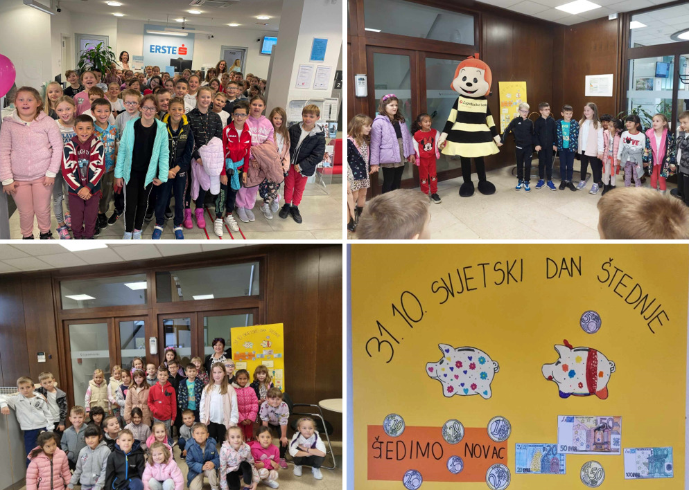 Uoči Svjetskog dana štednje, koji se obilježava 31. listopada, učenici 1.a, 1.b, 1.c i 1.d razreda u pratnji svojih učiteljica posjetili su poslovnicu Zagrebačke banke u Đurđevcu. Gostoljubive djelatnice govorile su učenicima o štednji, kako i zašto moramo i možemo štedjeti. Upoznale su učenike s vrstama kovanica i novčanica kojima se trenutno služimo. Pokazale su uređaje pomoću kojih se prebrojavaju kovanice i novčanice. Učenici su sa zanimanjem pratili izlaganje djelatnica kojima su uputili nekoliko pitanja i komentara vezano za novac i štednju. Na kraju posjeta uslijedilo je iznenađenje za sve učenike, Pčelica, koja je svima podijelila prigodne darove i slatkiše.