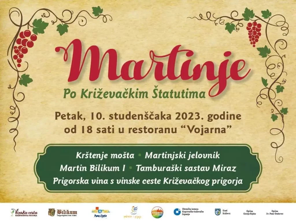 U Križevcima će se u Restoranu Vojarna u petak, 10. studenoga od 18.00 do 20.00 sati održati još jedno Martinje po Križevačkim štatutima. Bit će tu Martinjski jelovnik i neizostavna proba vina i krštenje mošta, a sve posjetitelje zabavljat će Tamburaški sastav Miraz.