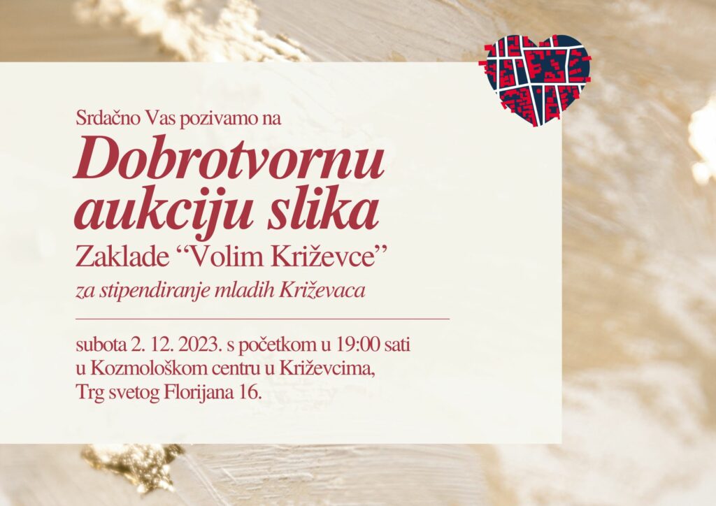 Zaklada za lokalni razvoj i solidarnost „Volim Križevce“ poziva na dobrotvornu aukciju slika za stipendiranje mladih Križevaca, koja će se održati u subotu, 2. prosinca 2023. godine u Kozmološkom centru u Križevcima s početkom u 19 sati.