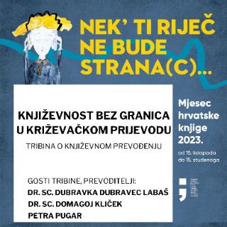 U Gradskoj knjižnici “Franjo Marković” Križevci u ponedjeljak 13. studenoga održat će se tribina o književnom prevođenju Književnost bez granica u križevačkom prijevodu. Tribina će se održati s početkom u 19.00 sati u multimedijskoj dvorani.