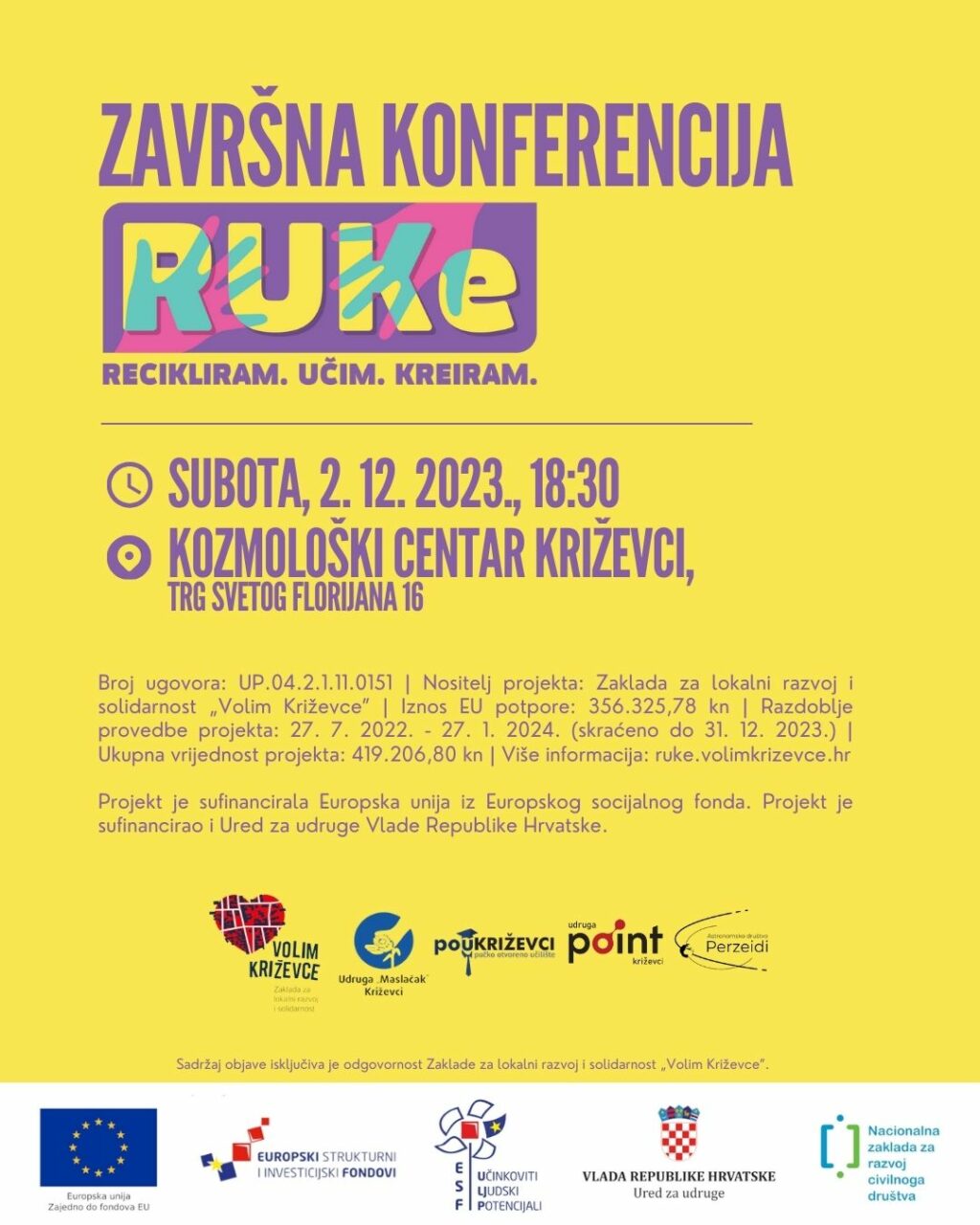Završna konferencija projekta RUKe (Recikliram, Kreiram, Učim) koji provodi Zaklada Volim Križevce s partnerima Udrugom “Maslačak” Križevci, Pučkim otvorenim učilištem Križevci, Udrugom P.O.I.N.T. i Astronomskim društvom Perzeidi održat će se u subotu 2. prosinca u 18.30 u Kozmološkom centru na Trgu svetog Florijana 16 u Križevcima.