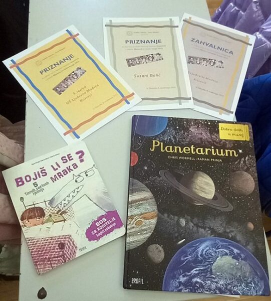 Učenice Antea Puček, Ines Oguman i Korina Juršetić iz 6. e i Nastasja Sokač iz 8. d nagrađene su u pojedinačnoj konkurenciji. Kao inspiracija poslužili su im motivi iz djela hrvatskih pisaca i prevoditelja Ivane Brlić-Mažuranić i Dobriše Cesarića, a Nastasja se bavila djelima koja je prevodila Ira Wacha-Biličić. Radovi su nastali u različitim likovnim tehnikama (drvene bojice, pastele, tempera, olovka).
