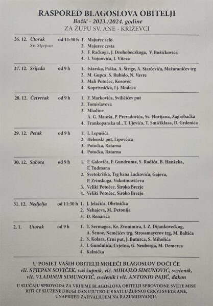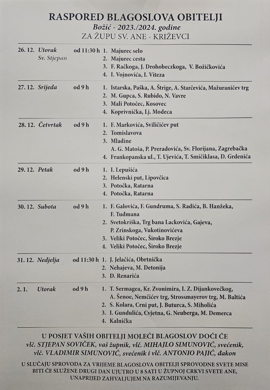 Blagoslov obitelji u župi sv. Ane u Križevcima redovno će se održavati prema navedenom rasporedu. U posjet obitelji moleći blagoslov doći će župnik Stjepan Soviček, velečasni Mihajlo Simunović, velečasni Vladimir Simunović i velečasni Antonio Pajić.
