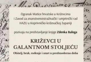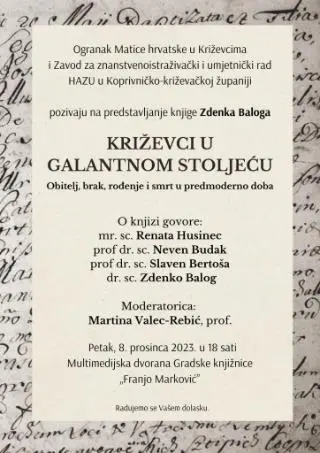 Ogranak Matica hrvatske u Križevcima i Zavod za znanstvenoistraživački i umjetnički rad HAZU u Koprivničko-križevačkoj županiji pozivaju na predstavljanje knjige Zdenka Baloga Križevci u galantnom stoljeću – obitelj, brak, rođenje i smrt u predmoderno doba u petak 8. prosinca 2023. u 18 sati u multimedijskoj dvorani Gradske knjižnice “Franjo Marković” Križevci.