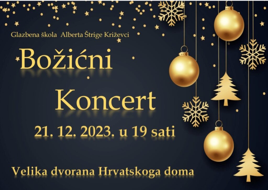 Glazbena škola Alberta Štrige Križevci poziva Vas na Božićni koncert koji će se održati u Velikoj dvorani Hrvatskog doma u četvrtak, 21.12. 2023. u 19 sati.