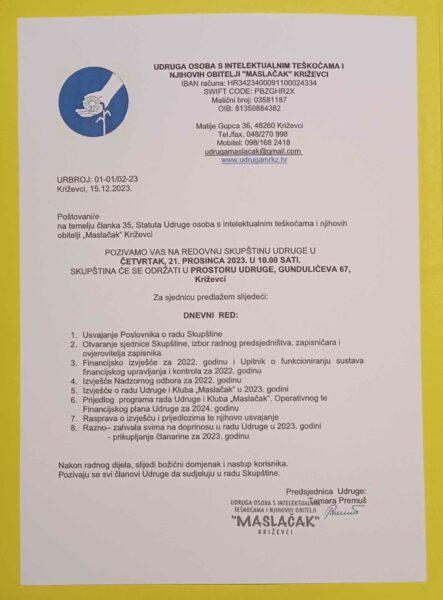 U četvrtak, 21.12.2023. održat će se godišnja skupština Udruge “Maslačak” Križevci u Gundulićevoj 67 u 10.00 sati. Na sjednici će se govoriti o osam točaka dnevnog reda.