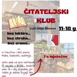 – Želja nam je sve one najčitatelje Olimpijada čitanja koji su sada već viši razredi, sve najčitatelje koji svake godine primaju priznanja, a već su odrasli, sve naše čajoljupce koji se više ne vide za stolom s mlađom ekipom, sve one koji sudjeluju u natjecanjima čitanja, poput Čitanjem do zvijezda, one koji jednostavno čitaju jer to vole… okupiti u zajedničkom druženju, jednom mjesečno u prostoru knjižnice koji ćemo sami odabrati. Budući članovi čitateljskog kluba mogu se prijaviti telefonski, elektroničkom poštom, na društvenim mrežama, osobno u knjižnici ili jednostavno bez ikakvih prijava doći na prvi zajednički susret 19. veljače u 18:00 – poručili su iz Gradske knjižnice “Franjo Marković”.