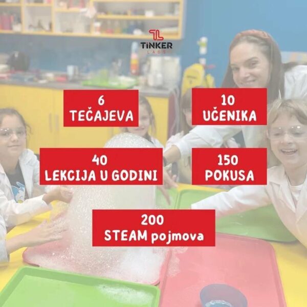 Tečaj za djecu Tinker Tots je od 4 do 6 godina, a Tinker Town za djecu od 7 do 12 godina. Svaki tjedan druga je tema iz STEAM područja, s preko 150 pokusa i 200 novih pojmova.