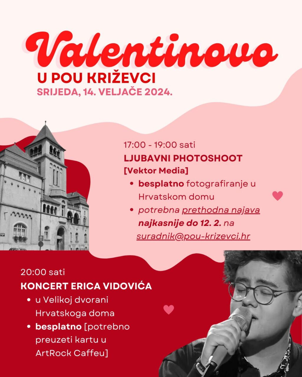 Tako će se u srijedu, 14. veljače od 17 do 19 sati održati Ljubavni photoshoot u suradnji s Vektor Media u prostorima Velike dvorane Hrvatskoga doma i na Vidikovcu na tornju Hrvatskoga doma, a nakon toga, u 20:00 započet će koncert najljepših ljubavnih pjesama u izvedbi talentiranog mladog glazbenika Erica Vidovića, poznatog po nastupima u emisiji The Voice te na hrvatskom izboru za pjesmu Eurovizije – Dora.