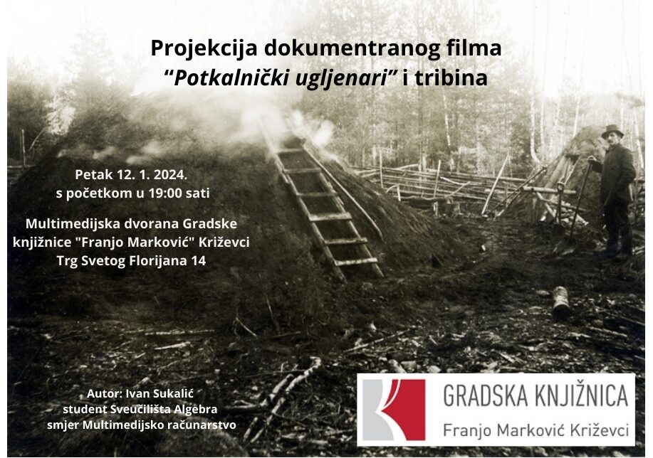 Gradska knjižnica “Franjo Marković” Križevci poziva na projekciju dokumentarnog filma “Potkalnički ugljenari” autora Ivana Sukalića. Projekcija će se održati u petak 12. siječnja 2024. godine s početkom u 19 sati u multimedijskoj dvorani.