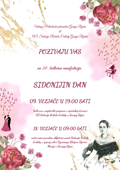 Udruga Potkalnički plemenitaši, u petak 9. veljače 2024. godine s početkom u 19 sati, organizira u Osnovnoj školi Sidonije Rubido Erdödy u Gornjoj Rijeci 20. Sidonijin dan.