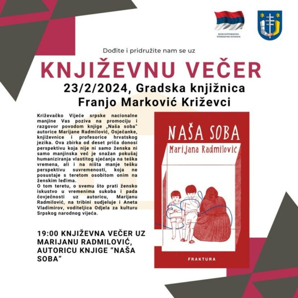 U petak, 23. veljače s početkom u 19 sati na odjelu beletristike u organizaciji križevačkog Vijeća srpske nacionalne manjine održat će se književna večer s Marijanom Radmilović uz predstavljanje njezine zbirke priče “Naša soba”, u izdanju Frakture.