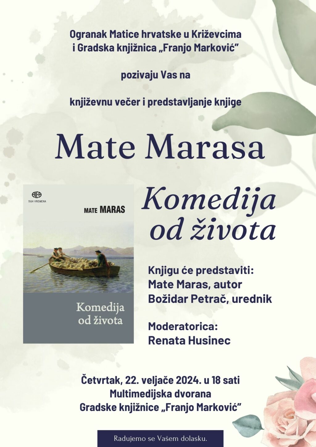 U četvrtak 22. veljače s početkom u 18 sati u multimedijskoj dvorani knjižnice bit će predstavljena knjiga Mate Marasa “Komedija od života” u organizaciji Ogranka Matice hrvatske u Križevcima i Gradske knjižnice “Franjo Marković” Križevci.