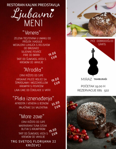 Restoran “Kalnik” Križevci organizira Valentinovo, a zaljubljene će zabavljati Tamburaški sastav Miraz.