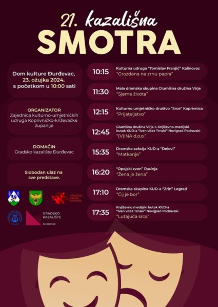 Pod pokroviteljstvom Koprivničko-križevačke županije, u subotu 23. ožujka 2024. godine u Domu kulture u Đurđevcu, s početkom u 10:00 sati, održava se 21. Županijska smotra kazališnih amatera. Organizator smotre je Zajednica kulturno umjetničkih udruga Koprivničko-križevačke županije, a suorganizator i domaćin Gradsko kazalište Đurđevac i grad Đurđevac.